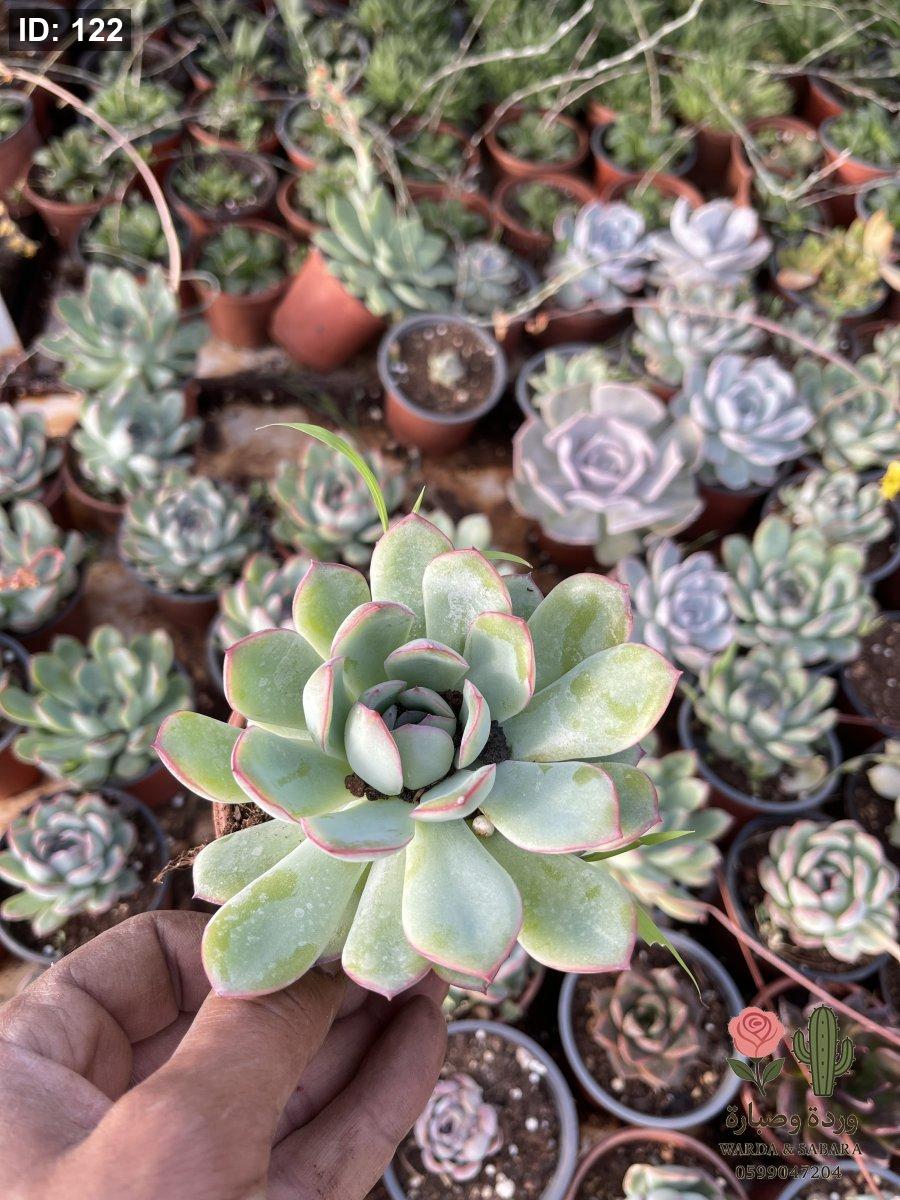 الاسم العلمي: Echeveria (تحديداً نوع يشبه Echeveria 'Pulidonis' نظراً للحواف الحمراء).