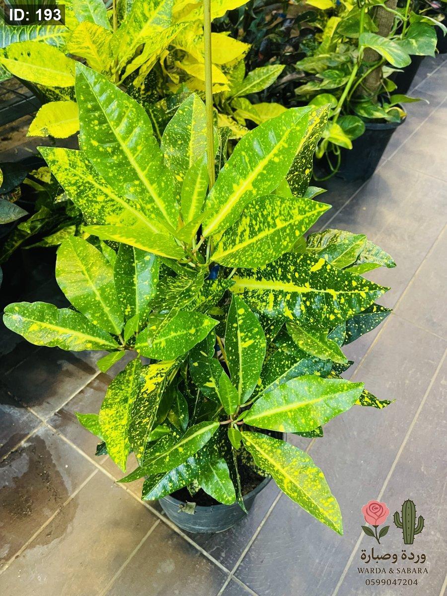 • الوصف: نبتة زينة ورقية مبهرة، تمتاز بأوراقها الجلدية اللامعة والمزينة بنقاط أو عروق صفراء ذهبية تبدو وكأنها مرشوشة بالطلاء. هي نبتة مثالية لإضافة تباين لوني رائع وسط النباتات الخضراء الأخرى، وتعطي انطباعاً بالفخامة والحيوية.