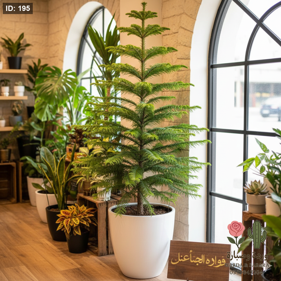 • الوصف: شجرة مخروطية فريدة تمتاز بتناسق أغصانها التي تنمو في طبقات أفقية منتظمة. أوراقها إبرية ناعمة الملمس ولونها أخضر زاهٍ، تعطي مظراً يشبه شجرة عيد الميلاد، وهي نبتة بطيئة النمو مما يحافظ على شكلها الأنيق لفترة طويلة.