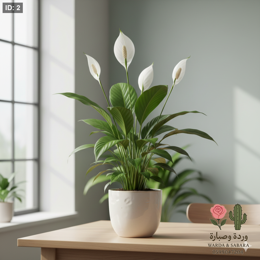 • شرح مبسط: نبتة داخلية شهيرة بأزهارها البيضاء التي تشبه أشرعة السفن، وهي من أفضل النباتات عالمياً في تنقية الهواء من السموم.