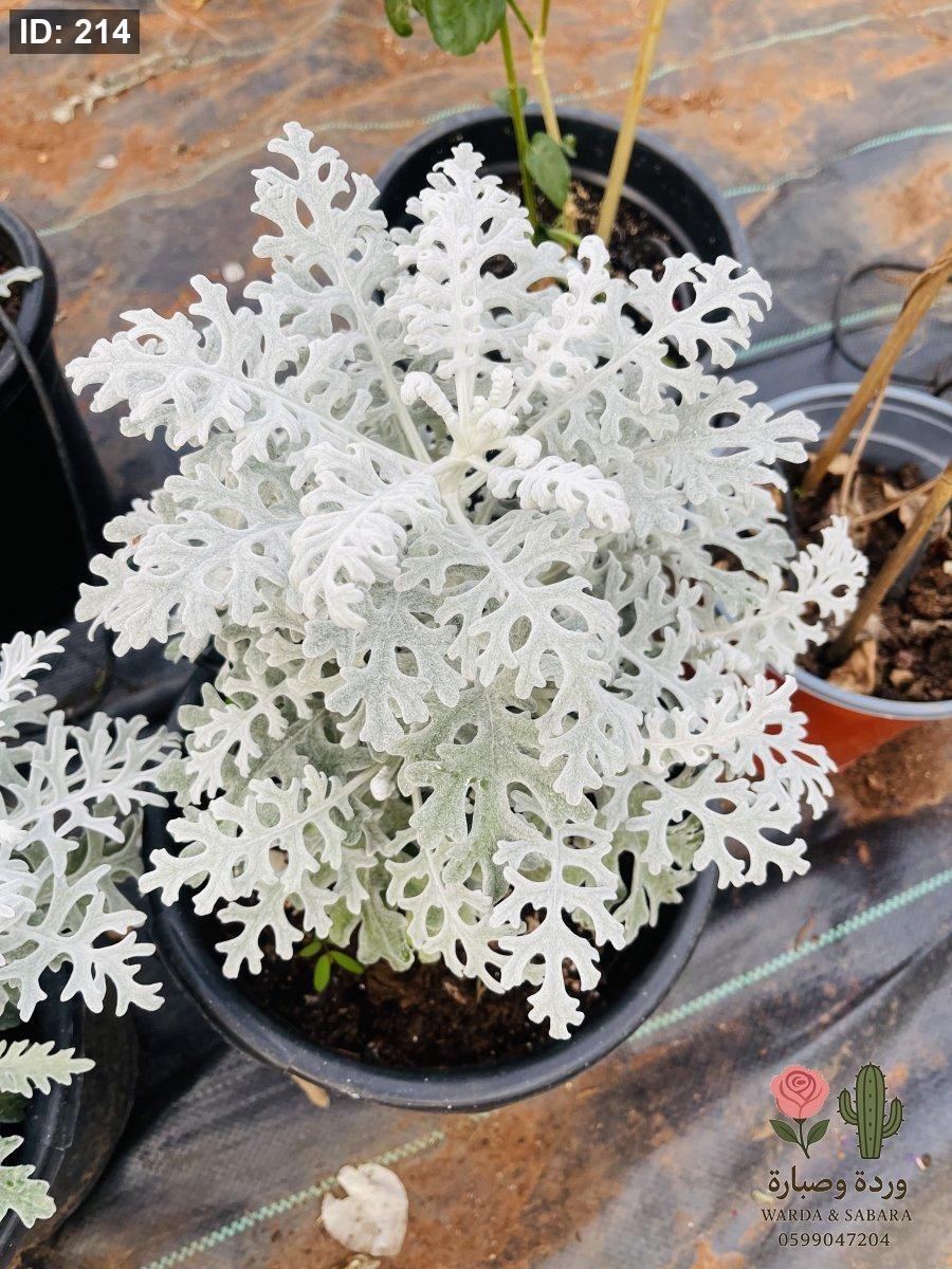 • الوصف: نبتة زينة فريدة جداً تمتاز بأوراقها المخملية ذات اللون الفضي المائل للبياض، والتي تبدو كأنها مغطاة بطبقة رقيقة من الثلج أو القطن. أوراقها مفصصة بشكل فني عميق، مما يجعلها من أجمل النباتات التي تكسر اللون الأخضر المعتاد في الحدائق.
