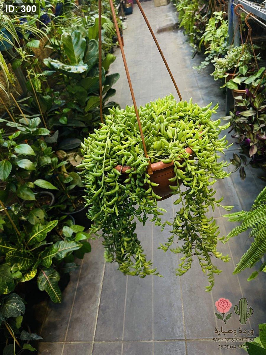 إذا كنت من محبي النباتات العصارية المتدلية، فإن "عقد الموز" هي الإضافة التي ستسحر الجميع. تتميز بأوراقها الخضراء النضرة التي تأخذ شكل الموز الصغير بدقة مذهلة، وتنمو على سيقان طويلة تتدلى بنعومة لترسم لوحة فنية خضراء في زوايا منزلك. نبتة مثالية للسلال المعلقة والرفوف العالية.
