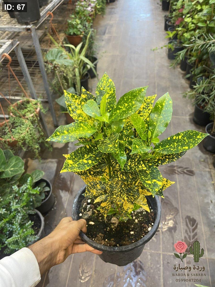 انفجار من الألوان في أصيص صغير: يتميز الميني كروتون بأوراقه الضيقة والمدببة التي تمزج بين الأصفر الذهبي، البرتقالي الدافئ، والأخضر الداكن. هو الخيار المثالي لإضافة لمسة "استوائية" مبهجة للمكاتب والمساحات الضيقة، حيث ينمو بشكل متراص وأنيق يجعله قطعة ديكور حية لا تُنسى.